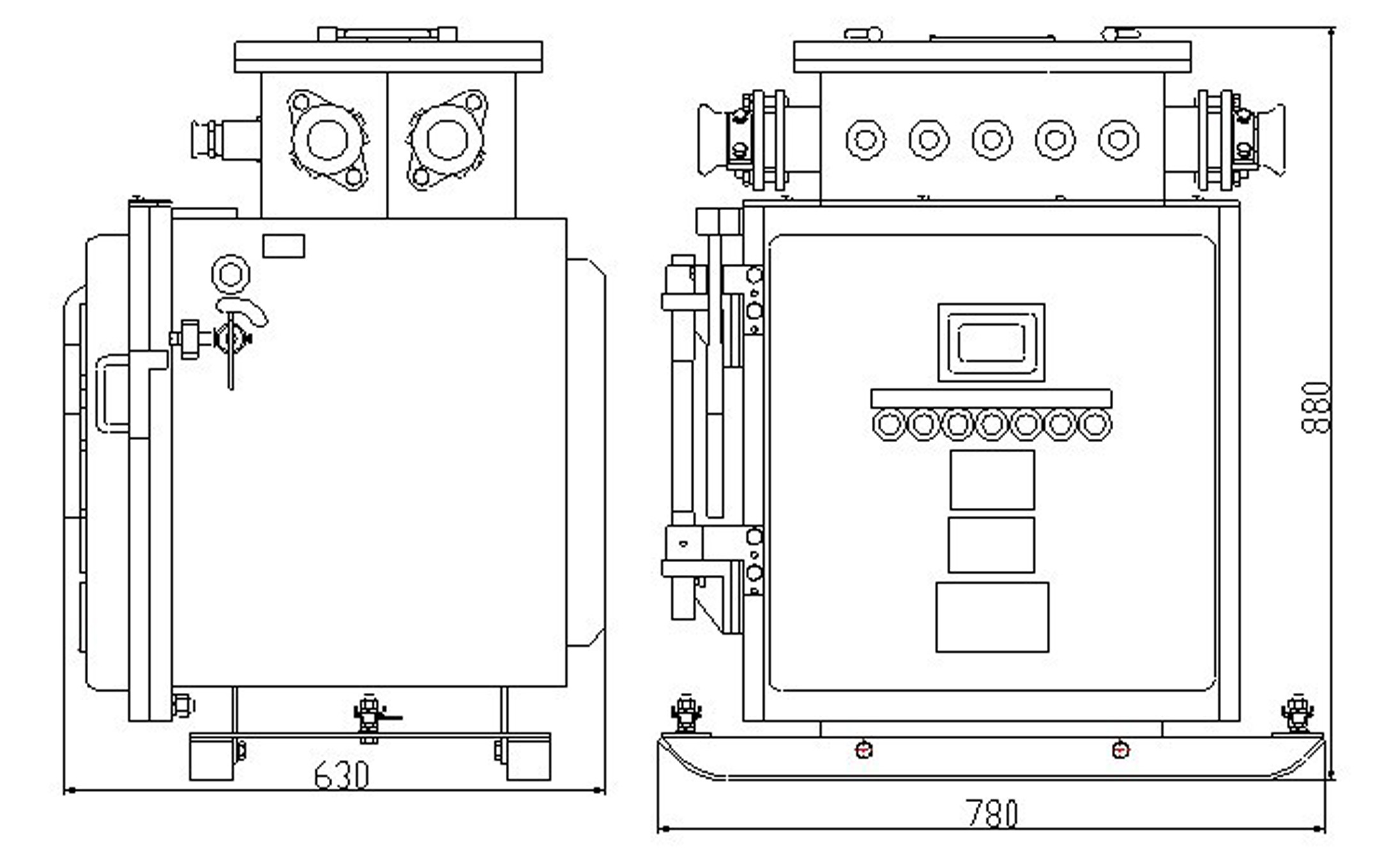 綜合裝置由隔爆外殼、主變壓器和控制部分等組成。隔爆外殼為方形,殼蓋與殼身采用滑動止口結(jié)構(gòu),開啟方便。外殼上部的接線箱作為引進和引出電纜用,外殼右側(cè)裝有操作組合開關(guān)的手柄,并有可靠的機械聯(lián)鎖裝置,門蓋上裝有控制按鈕和試驗按鈕,門蓋上有一觀察窗,可以從外面觀察到裝置里面液晶漢顯顯示屏的指示狀態(tài)。殼體內(nèi)的控制部分由控制器件板和真空交流接觸器板組成。在控制器件板上裝有微電腦控制器、液晶顯示屏、電流取樣板、電流傳感器、濾波器、電源控制變壓器、試驗電阻、保險等器件。真空交流接觸器板上裝有真空交流接觸器、管式熔斷器,電流互感器,三相電抗器等器件?刂破骷迮c真空交流接觸器板通過一組航空插件及連線構(gòu)成聯(lián)系。防爆外殼箱體內(nèi)裝有主變壓器。